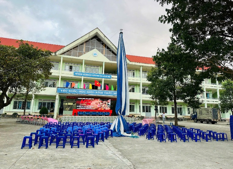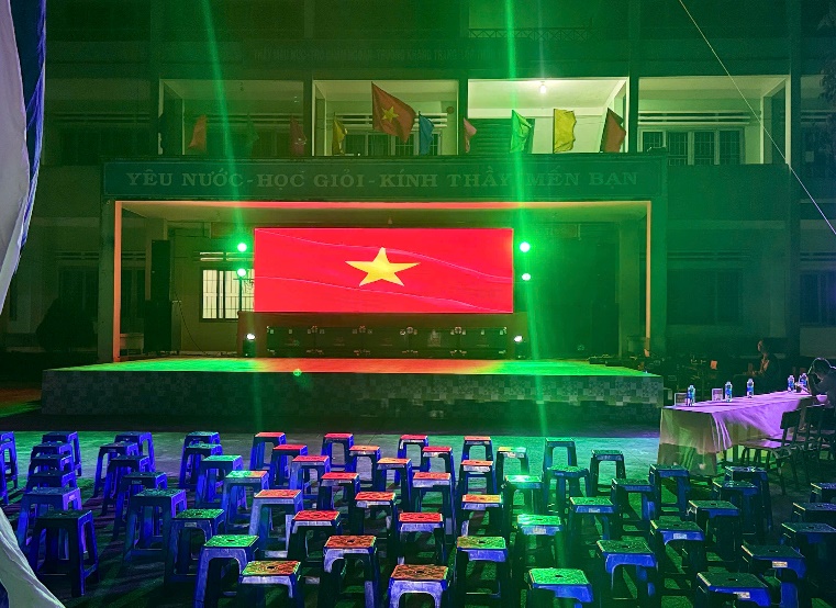 Công tác chuẩn bị sân khấu, cơ sở vật chất cho Chương trình chiếu phim miễn phí “Mưa đỏ” tại sân trường THPT Hùng Vương – Quảng Phú.