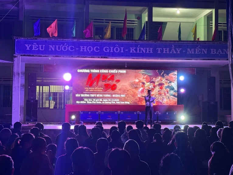 Nhằm thiết thực chào mừng sự kiện ý nghĩa này, thực hiện sự phối hợp với Ủy ban MTTQ Việt Nam xã Quảng Phú, tối ngày 22/12/2025, tại sân trường THPT Hùng Vương – Quảng Phú, nhà trường đã tạo điều kiện tổ chức Chương trình chiếu phim miễn phí bộ phim “Mưa đỏ” phục vụ cán bộ, giáo viên, nhân viên, học sinh và đông đảo Nhân dân trên địa bàn xã.